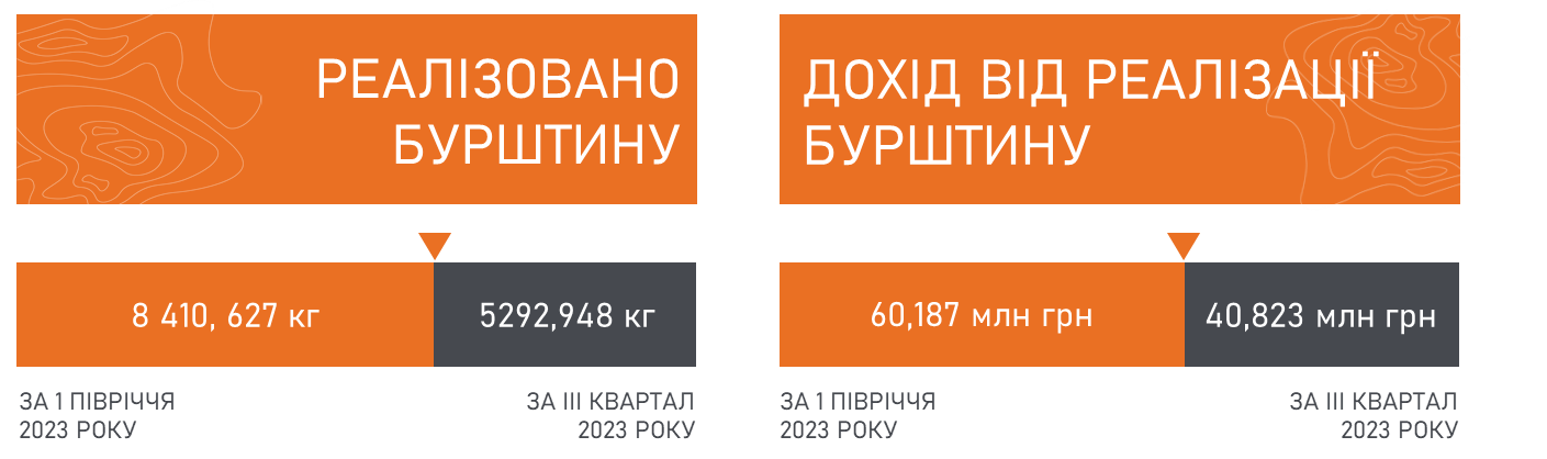Комунальне підприємство «Волиньприродоресурс» у розрізі виконання договору спільної діяльності з ТОВ «Надровидобування» за І півріччя 2023 року видобуло – 7 677, 713 кг бурштину різних фракцій та груп якості, реалізовано – 8 410, 627 кг на загальну суму – 60,187 млн грн. За ІІІ квартал 2023 року видобуто 5022,148 кг бурштину, реалізовано – 5292,948 кг бурштину на суму 40 823 616,47 грн, залишок бурштину на складі становить 920,019 кг.