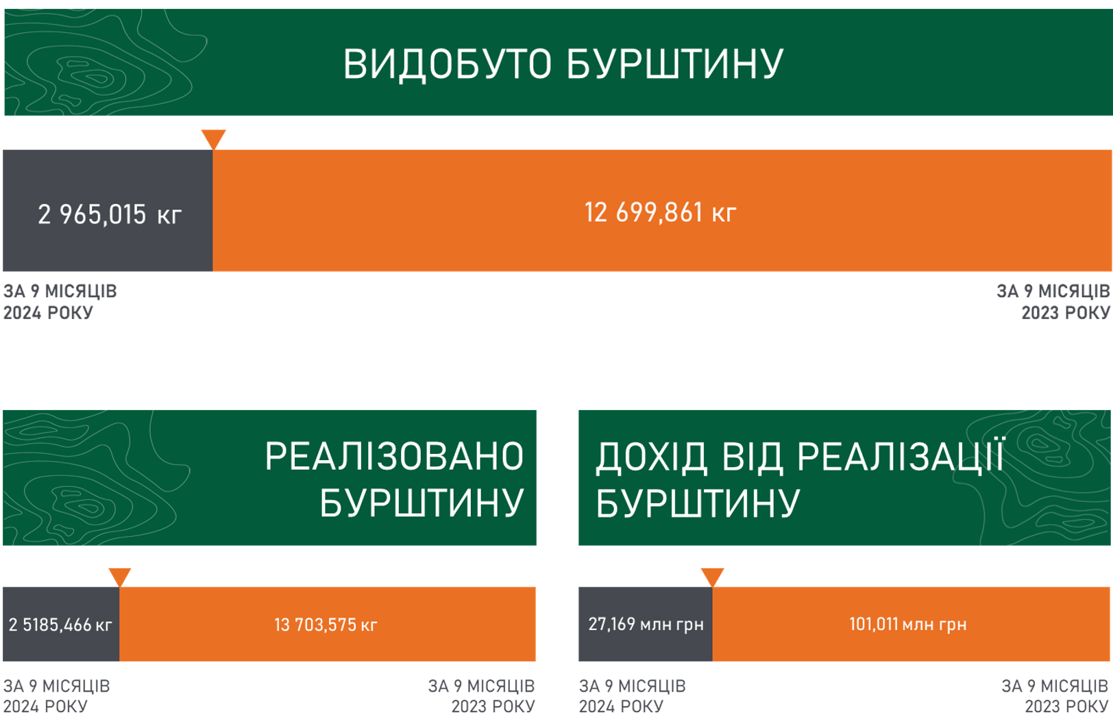За аналогічний період - 9 місяців 2023 року - видобуто 12 699,861 кг бурштину різних фракцій та груп якості, реалізовано – 13 703,575 кг на загальну суму 101,011 млн грн. Залишок бурштину на складі станом на 30.09.2023 року становив 920,019 кг бурштину.