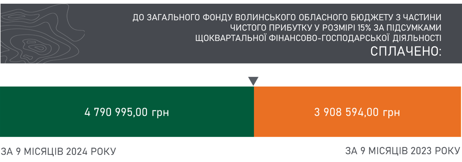 До загального фонду Волинського обласного бюджету з частини чистого прибутку у розмірі 15% за підсумками щоквартальної фінансово-господарської діяльності за 9 місяців 2024 року сплачено 4 790 995,00 грн.