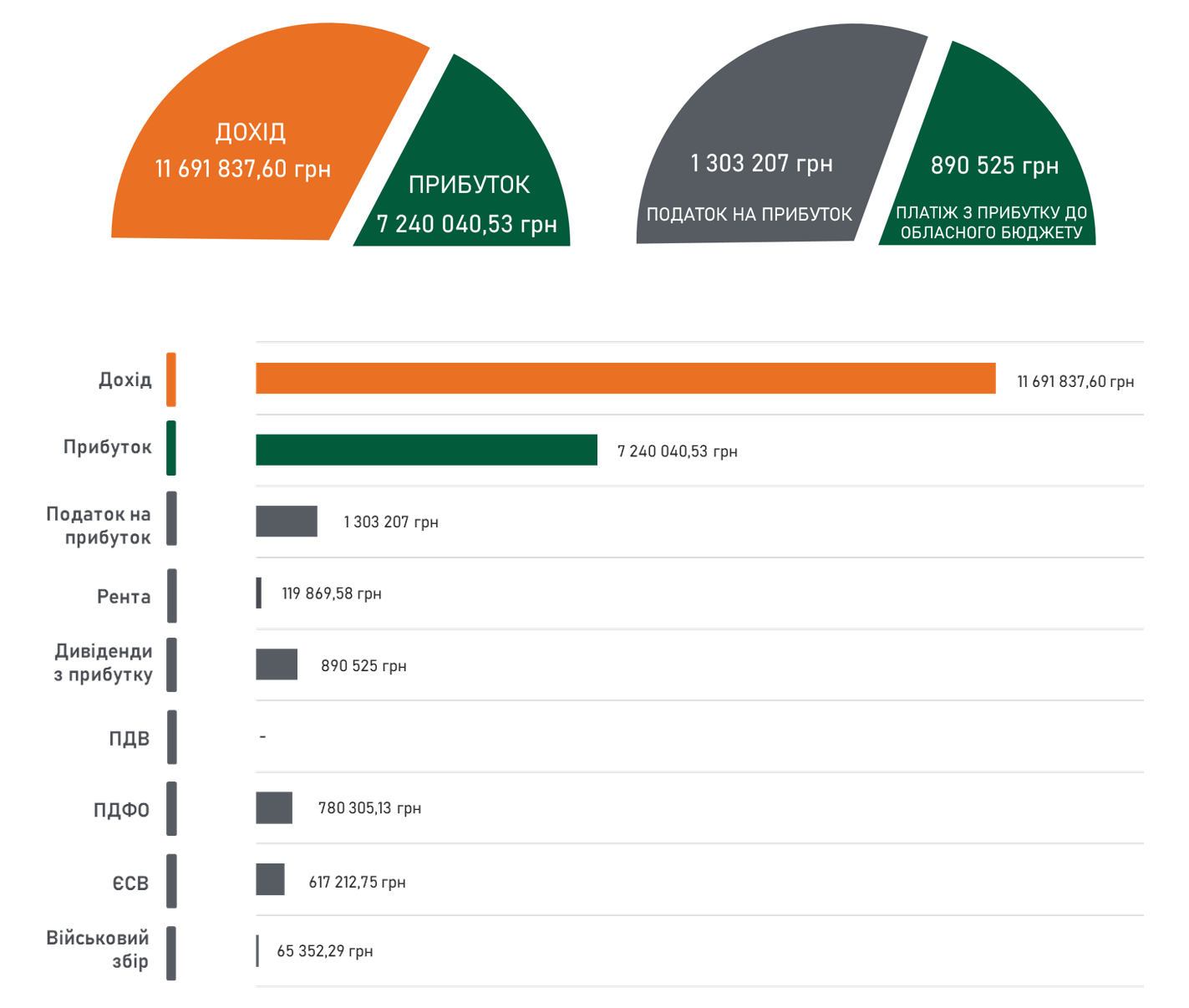 Дохід підприємства за І квартал 2024 року становив 11 691 837,60 грн, прибуток – 7 240 040,53 грн. Окремо на графіку показано також податок на прибуток, ренту, дивіденди з прибутку, ПДВ, ПДФО, ЄСВ та військовий збір.