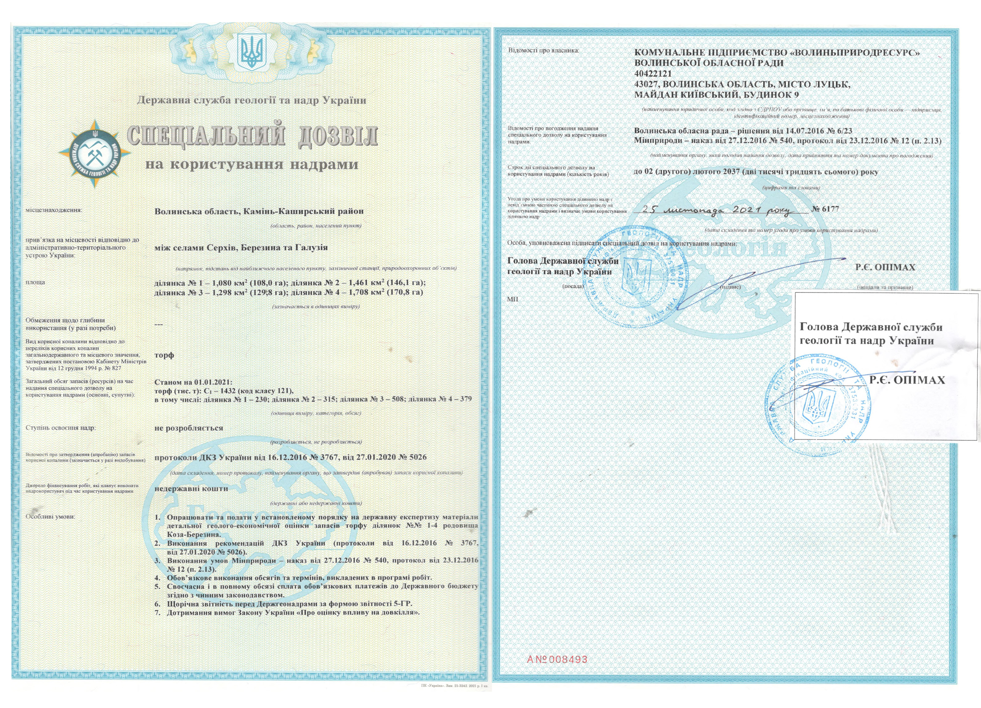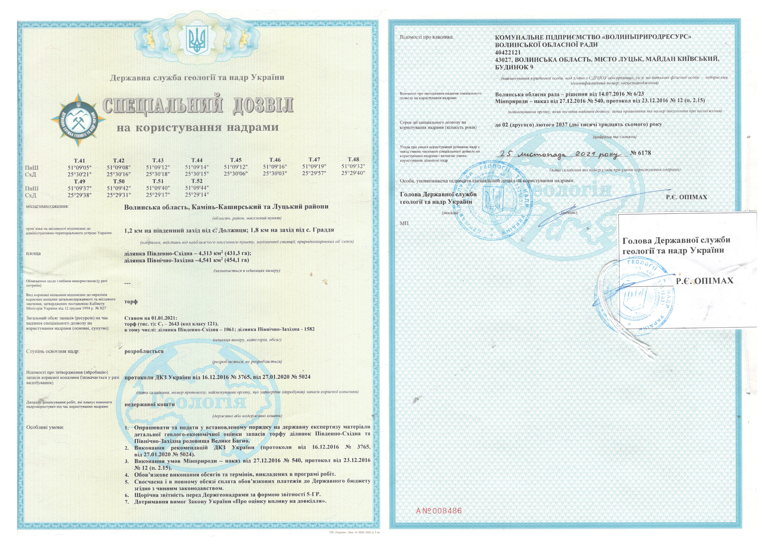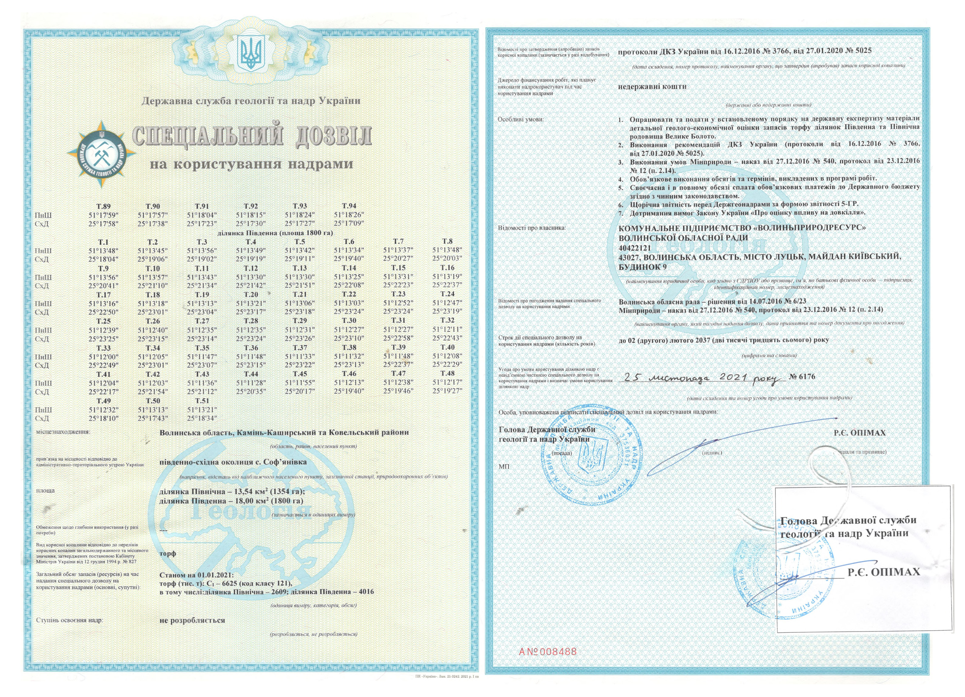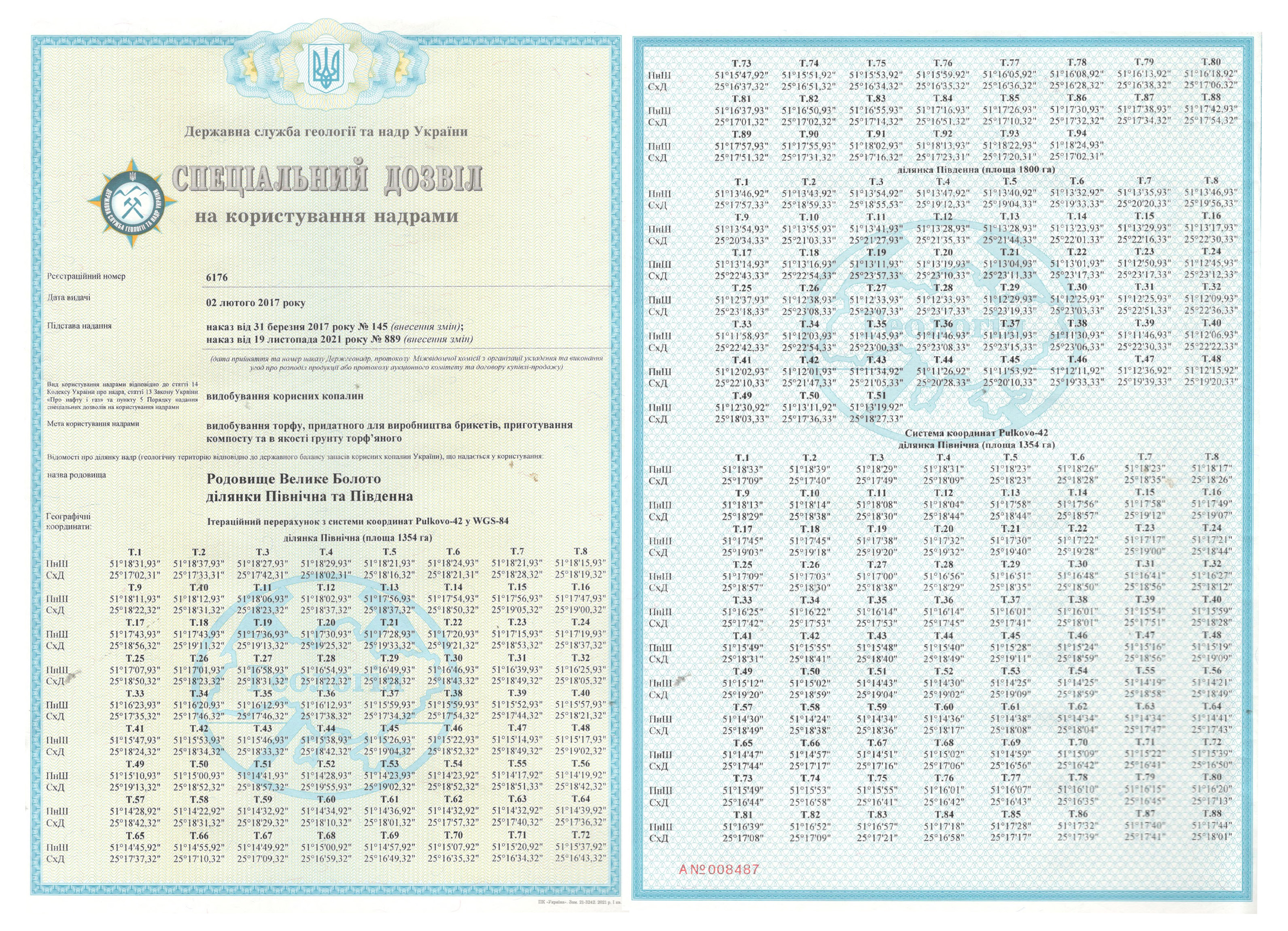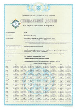 Спеціальний дозвіл №6176 (родовище Велике Болото) складається з двох ділянок: Північна – S = 1 354 га, Південна – S = 1 800 га; загальна площа – 3 154 га.