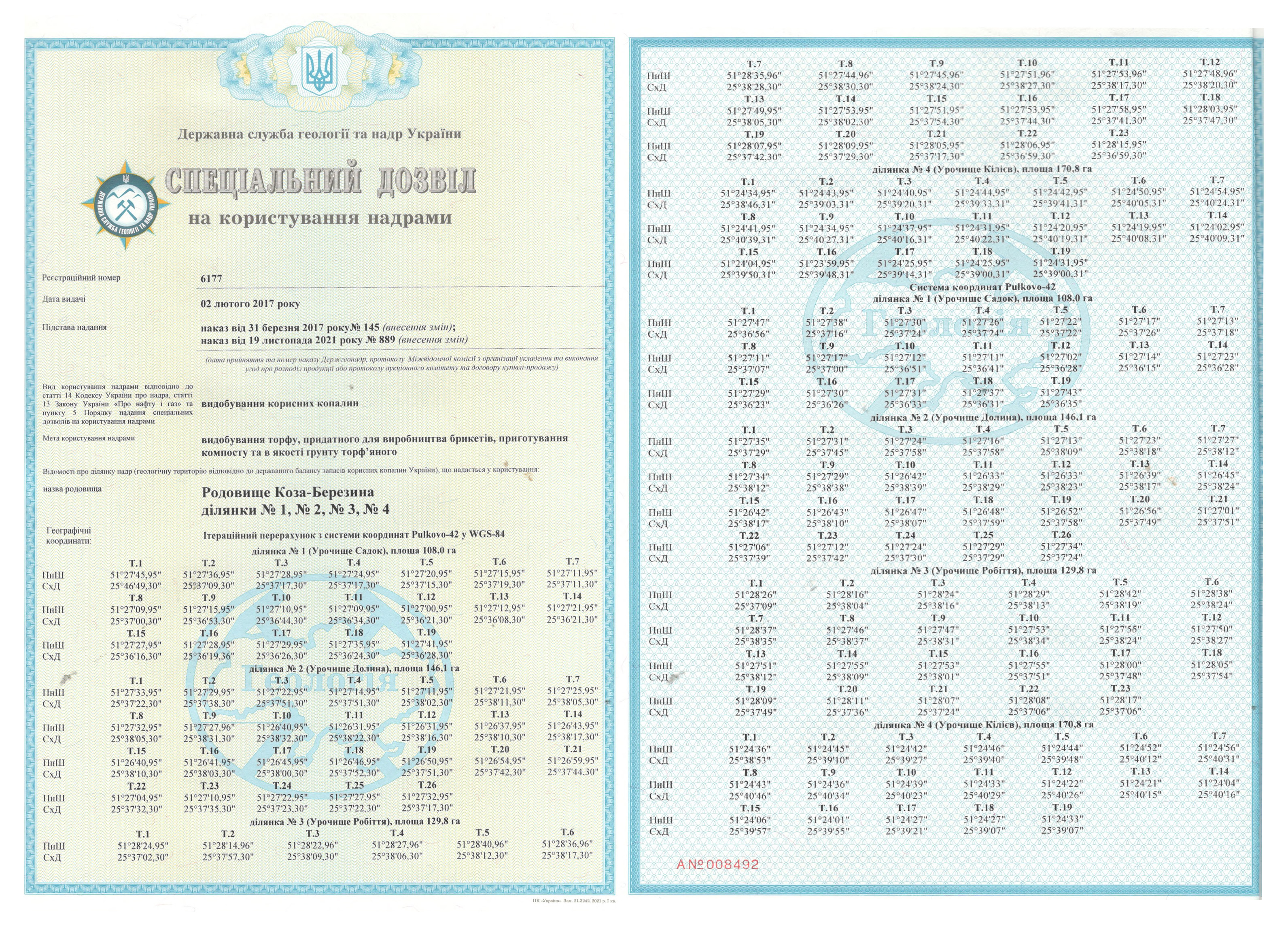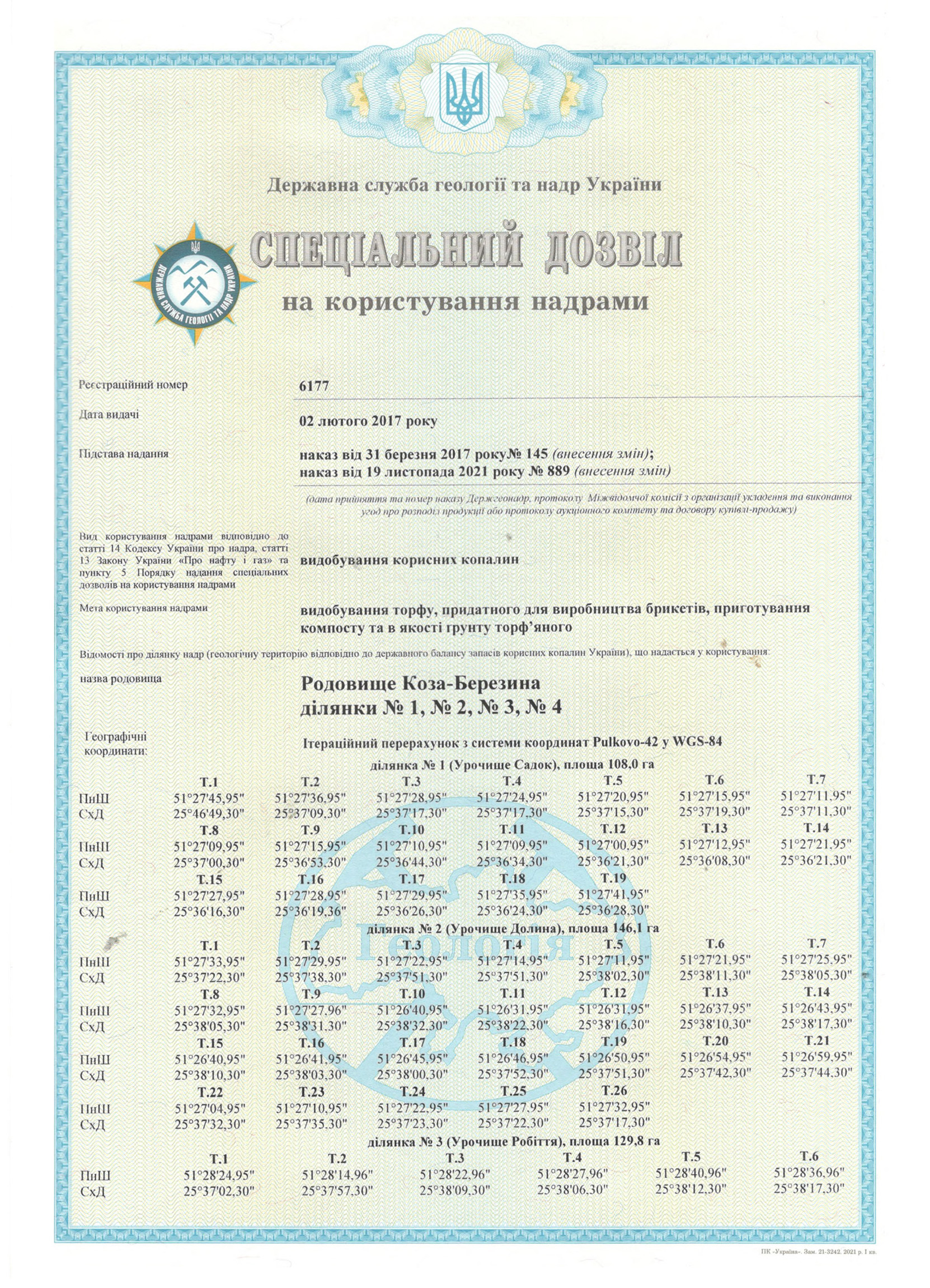 Спеціальний дозвіл №6177 (родовище Коза-Березина) складається з чотирьох ділянок: №1 (Урочище Садок) – S = 108,0 га, №2 (Урочище Долина) – S = 146,1 га, №3 (Урочище Робіття) – S = 129,8 га, №4 (Урочище Кілієв) – S = 170,8 га; загальна площа – 554,7 га.