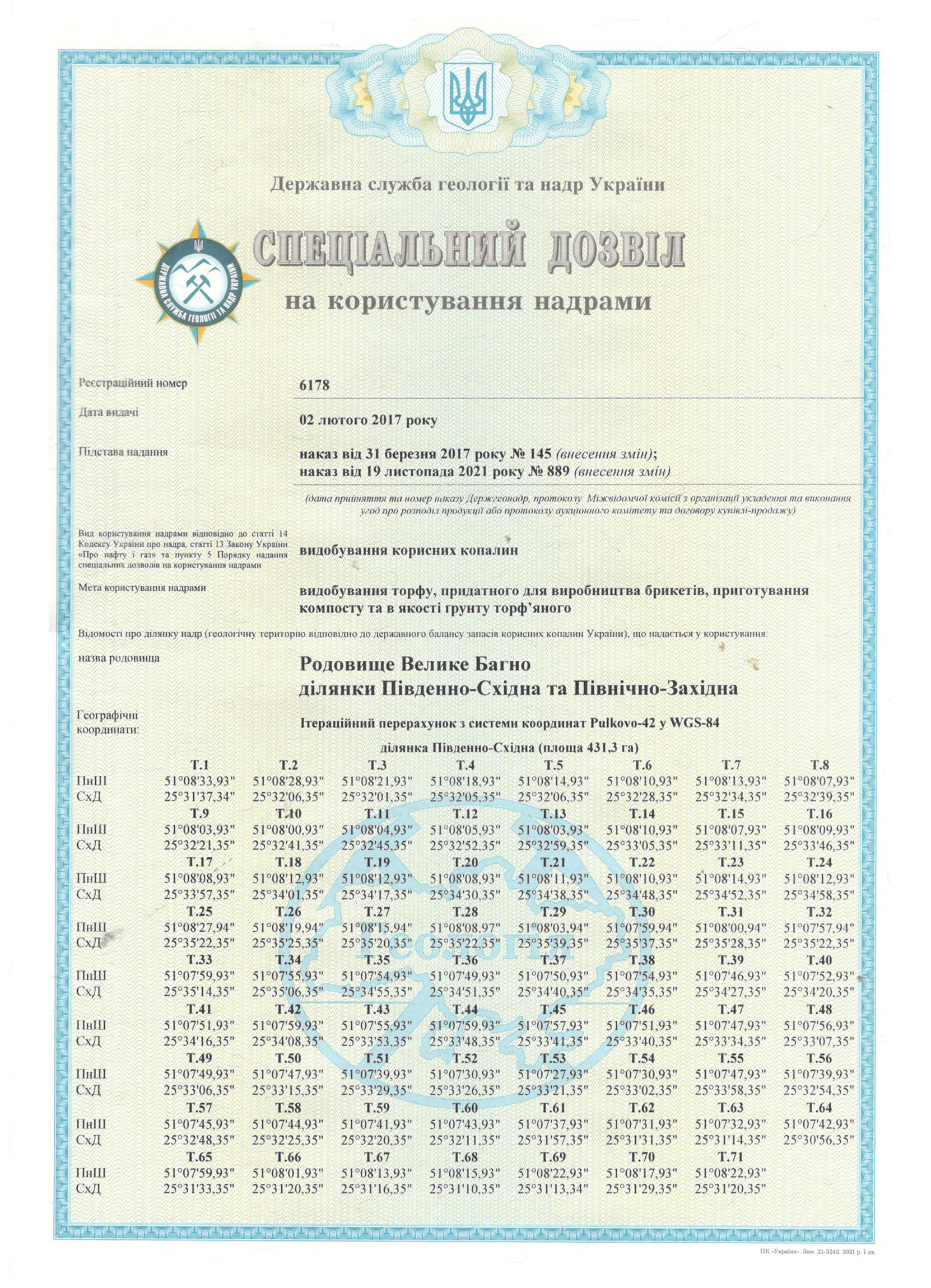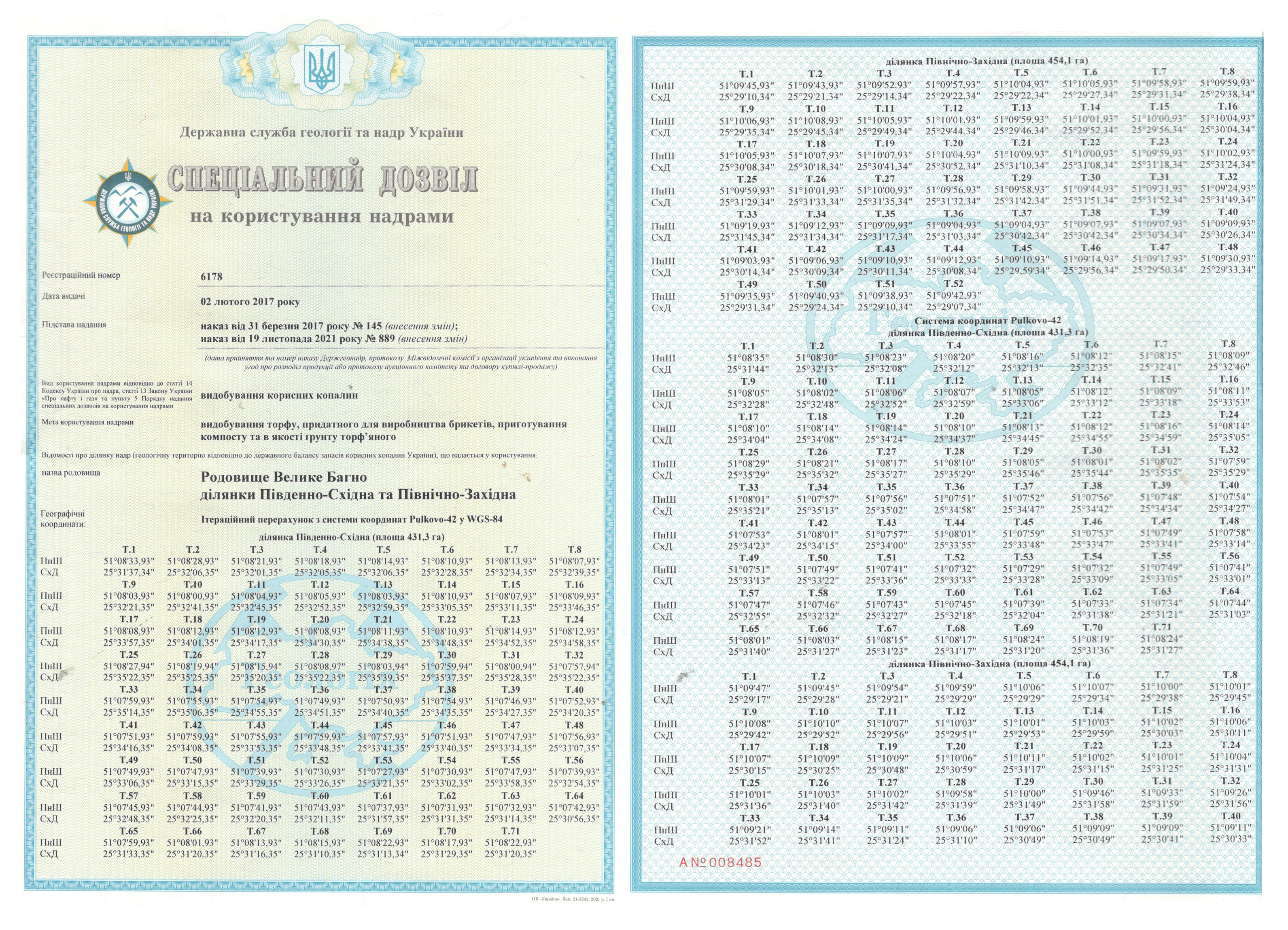 Спеціальний дозвіл №6178 (родовище Велике Багно) складається з двох ділянок: Південно-Східна – S = 431,3 га, Північно-Західна – S = 454,1 га; загальна площа – 885,4 га.