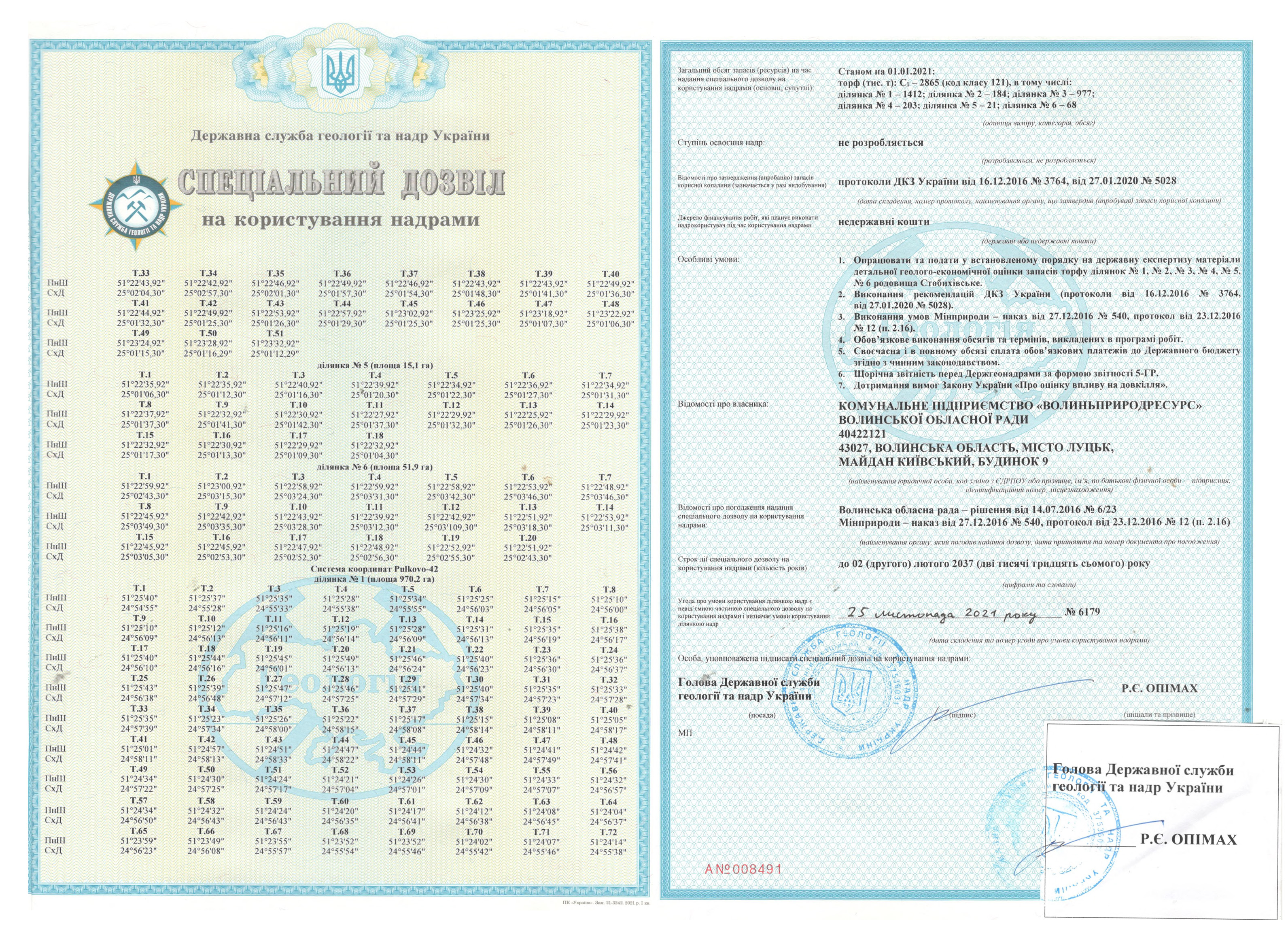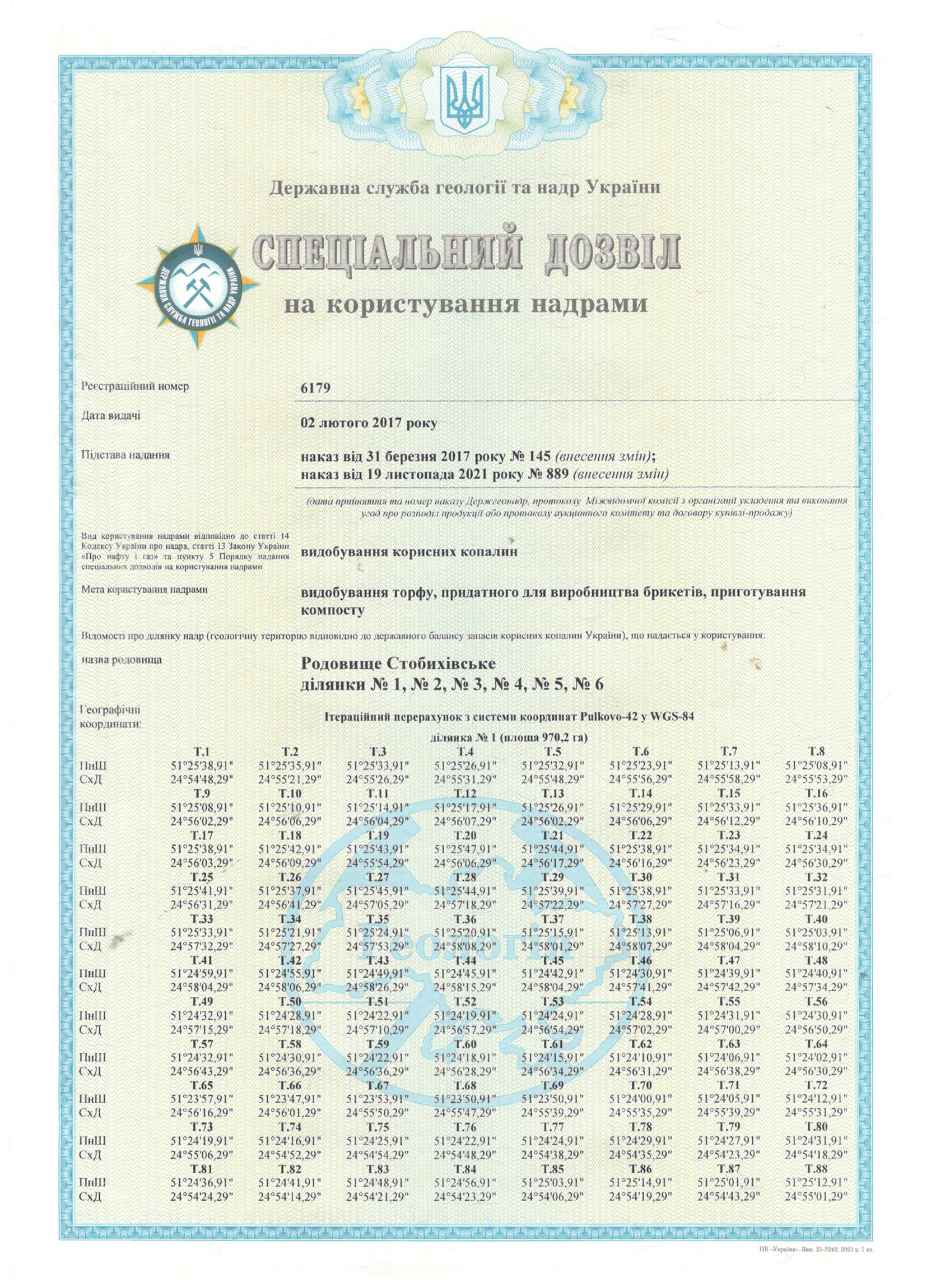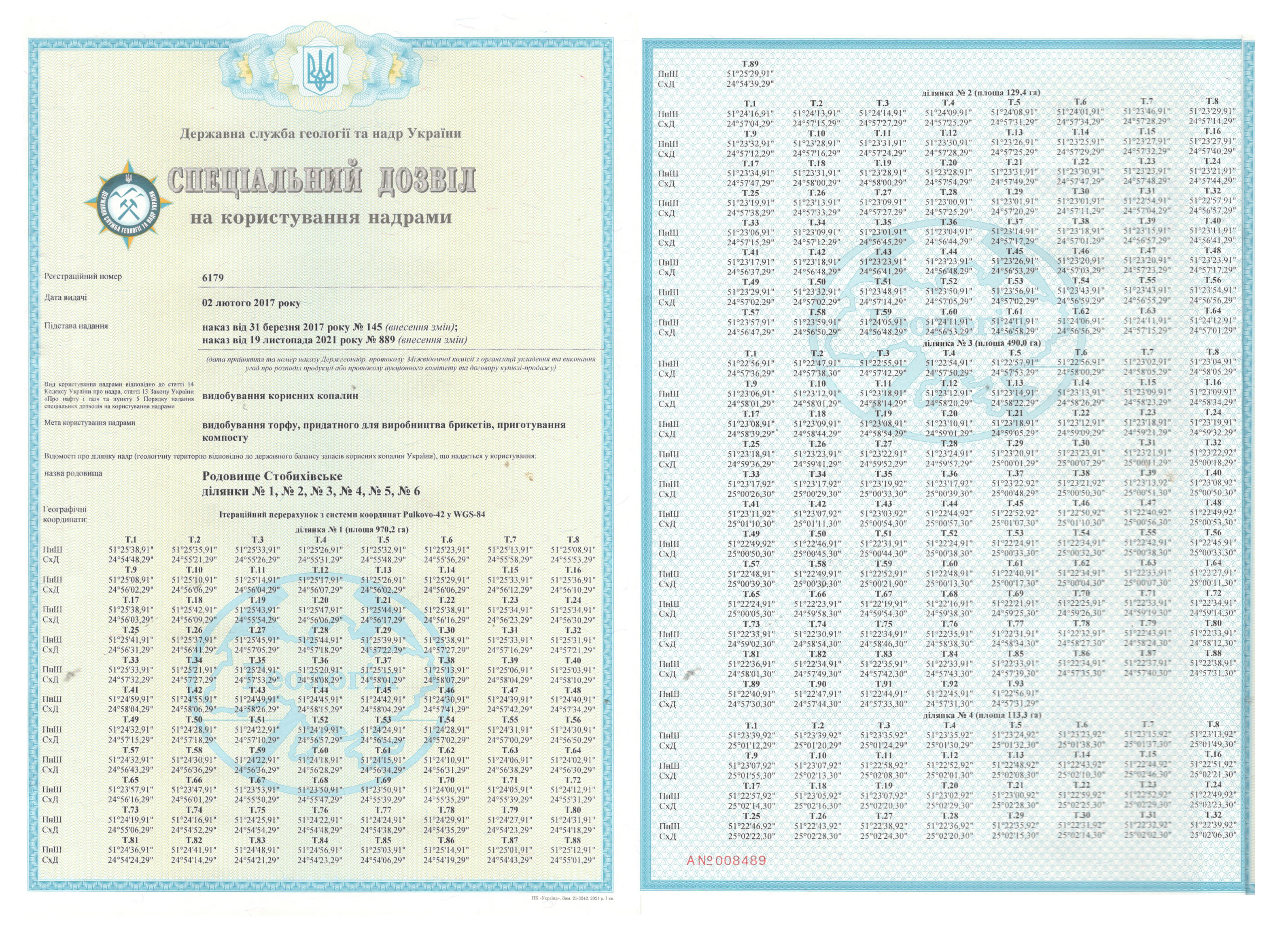 Спеціальний дозвіл №6179 (родовище Стобихівське) складається з шести ділянок: №1 – S = 970,2 га, №2 – S = 129,4 га, №3 – S = 490,0 га, №4 – S = 113,3 га, №5 – S = 15,1 га, №6 – S = 51,9 га; загальна площа – 1 769,9 га.